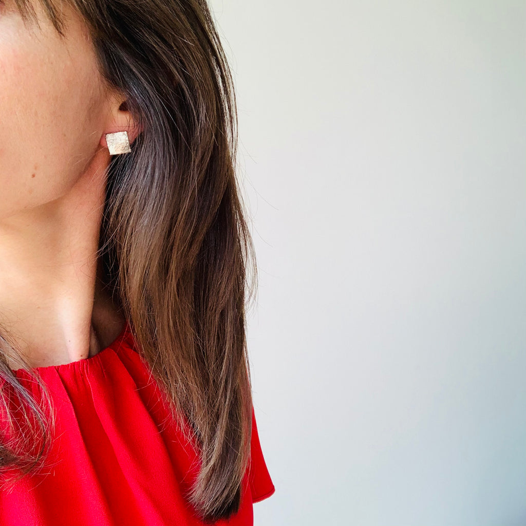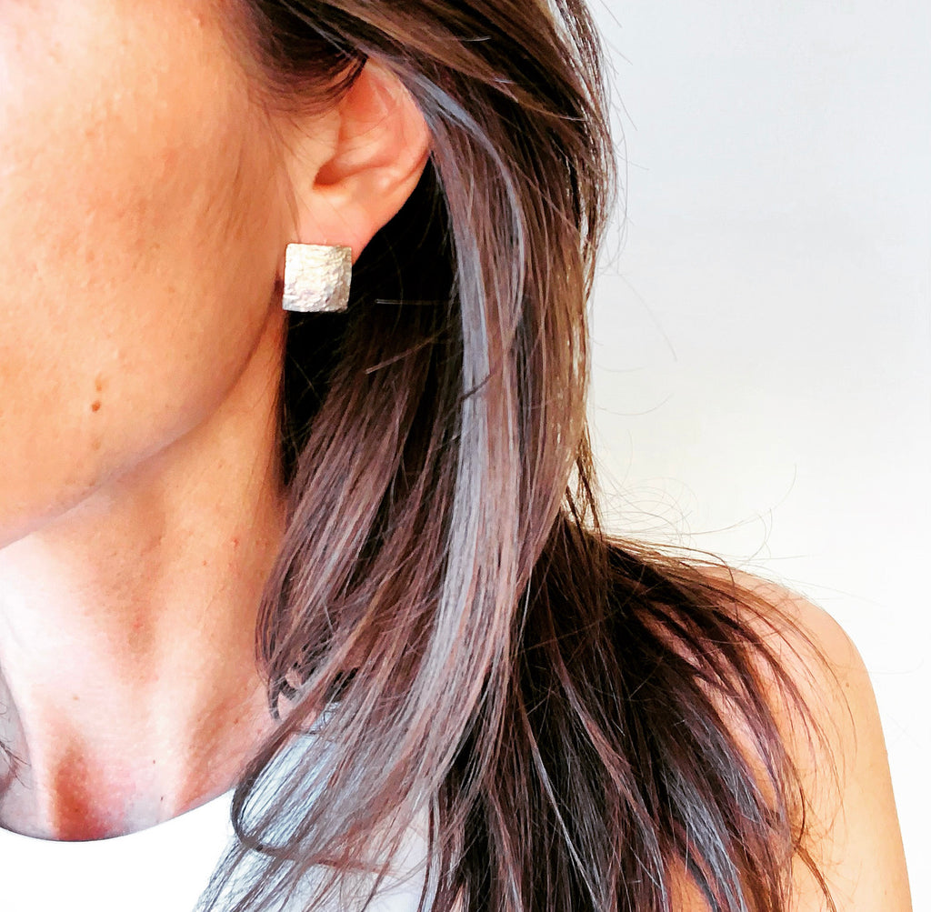 Gli orecchini "Scudi" presenta quadrati bombati con una texture naturale, realizzato con un attrezzo creato da Henry River. Questo gioiello offre un design unico che combina la forma elegante dei cerchi e la bellezza e l'autenticità delle texture naturali. Ogni quadrato rappresenta uno "scudo", simboleggiando la protezione e la forza. Indossare questi orecchini è un modo per portare con sé un pezzo di artigianato originale e un simbolo di sicurezza e bellezza naturale.