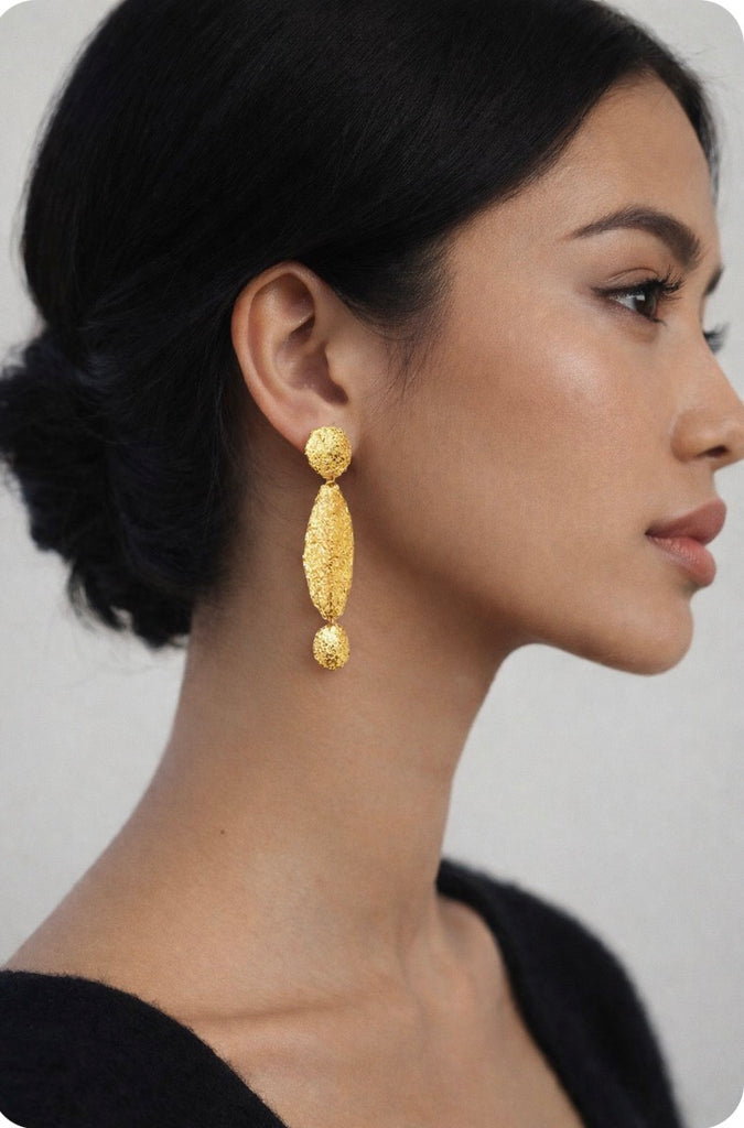 Indossati, gli orecchini accompagnano il viso con linee allungate e riflessi caldi, creando un movimento elegante che illumina il profilo con naturale armonia.
